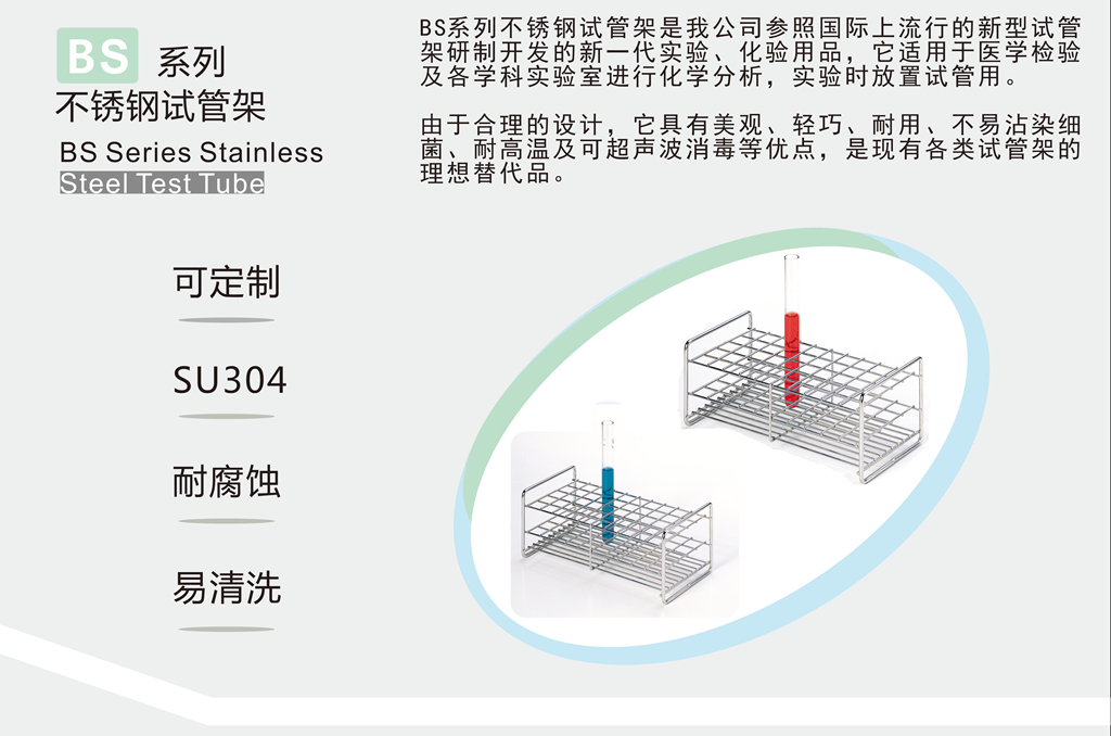 Bs系列不锈钢试管架是我公司参照国际上流行的新型试管架研发的新一代实验,化验用品,它适用于医学检验及各学科实验室进行化学分析,实验时放置试管用。本产品采用SS304不锈钢丝制成,规格齐全,特殊规格可按用户要求制造。由于合理的设计它有美观、轻巧、耐用及不易沾染细菌等优点,是现有各类试管架的理想替代产品。