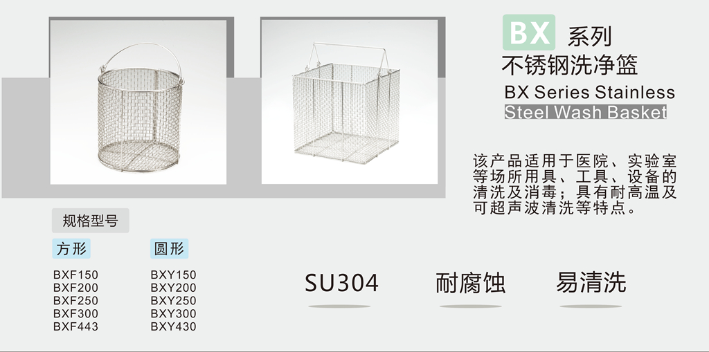 BX系列不锈钢洗净篮采用SS304不锈钢丝制成,是专业用于医院、实验室等地方的用具、工具,设备的清洁,消毒。是现代清洗,消毒的必备产品。